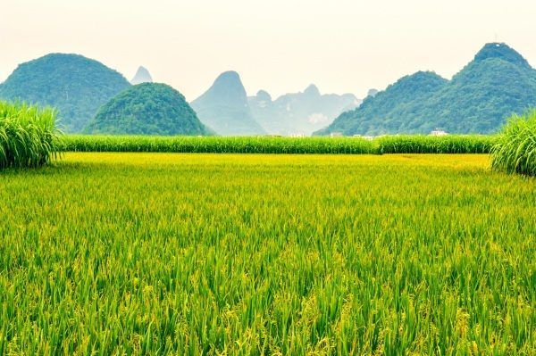 在广西放眼望去,田园山水之间皆是稻田、蔗田、玉米田等,眼光所及皆是绿色。在文人笔下,诗意描写到典型的喀斯特峰林地貌景观,写到“凤尾萧萧,龙吟嘀嘀”的碧江竹影,写到古风淳厚的壮汉等民居村落。在广大田园绿色的之中,到处点缀着情态各异的山峰。在山峰下的绿色之间,静静地流淌着弯弯曲曲的清清江、河水。
