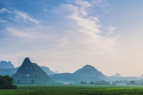 在广西放眼望去,田园山水之间皆是稻田、蔗田、玉米田等,眼光所及皆是绿色。在文人笔下,诗意描写到典型的喀斯特峰林地貌景观,写到“凤尾萧萧,龙吟嘀嘀”的碧江竹影,写到古风淳厚的壮汉等民居村落。在广大田园绿色的之中,到处点缀着情态各异的山峰。在山峰下的绿色之间,静静地流淌着弯弯曲曲的清清江、河水。